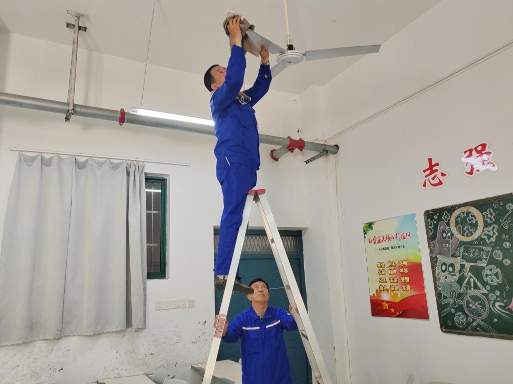 高温下,他们实行“早六晚四”错峰作业,随身携带藿香正气水,背后汗碱一层叠一层,却没人放慢节奏。截至开学前,五百余台吊扇、空调完成深度保洁、安全复检,广场成百近千块松动、碎裂地砖全部更新,找平、色差调整一次到位。